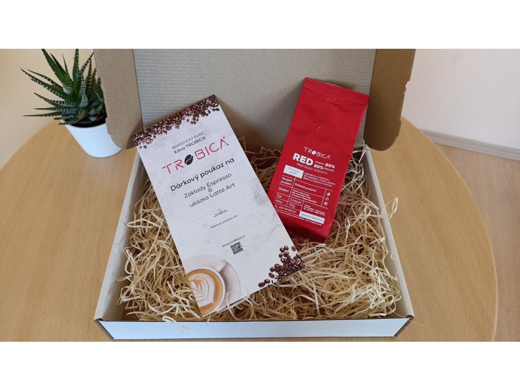 Dárková krabička + 50 g kávy TROBICA Red zdarma. |