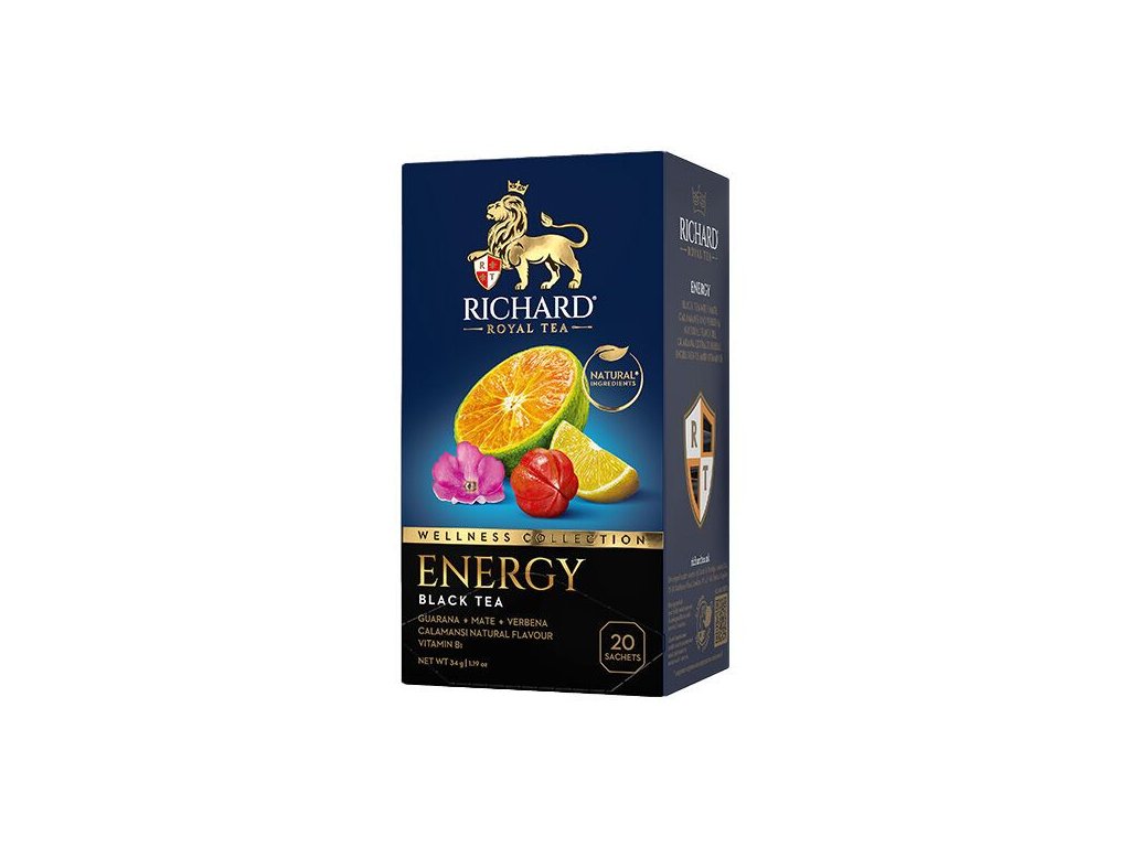 Richard Energy je intenzivní směs černého čaje, maté, přírodní příchuti calamansi, verbény a guarany s esenciálními oleji z máty, limetky a citrónu, obohacená hroznovou šťávou, ibiškem, citrónovou trávou, verbenou a kůrou, extraktem z guarany, ženšenem, rozmarýnem a vitaminem B1 (thiaminem), která nabízí intenzivní a energizující zážitek.