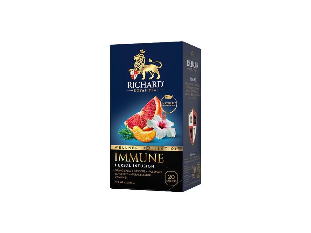 Richard Immune je speciální směs obsahující ibišek, kousky jablek, šípek, list ostružiny, přírodní aroma mandarinky a červeného pomeranče s přírodním extraktem z grapefruitu, mandarinkovým, citrónovým, pomerančovým a limetkovým olejem, pomerančovou kůrou, rozmarýnem a vitamínem B5 (kyselinou pantotenovou), která podporuje imunitní systém a nabízí osvěžující chuťový zážitek.